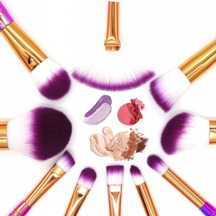 Zestaw 10 pędzli z włosia syntetycznego, z drewnianym trzonkiem, osadzone w pięknej skuwce to podstawa perfekcyjnego makijażu. Dzięki syntetycznemu włosiu, który jest gładki w przeciwieństwie do włosia naturalnego, pędzle te nie zatrzymują na sobie produktów kosmetycznych powodując ich mniejsze zużycie. Dodatkowo włosie takie jest łatwiejsze w utrzymaniu czystości (można je myć mydłem pod bieżącą wodą) i mniej podatne na odkształcenia.